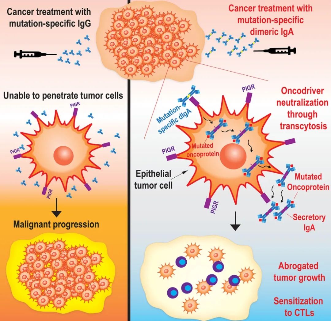 这项研究探索了二聚体IgA (dIgA) 在癌症治疗中的创新应用。研究者发现,dIgA能够有效地针对并中和细胞内的癌基因驱动因子,如KRASG12D和IDH1R132H,从而在细胞培养和动物模型中抑制肿瘤细胞的增殖和肿瘤的生长。