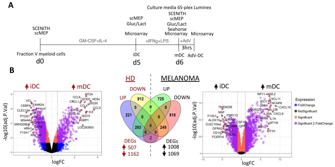癌症疫苗的效果仍然较弱,对抗原呈递细胞在癌症中的功能机制的理解可能有助于改进疫苗设计和结果。在这里,我们分析了在晚期黑色素瘤的DC疫苗试验中登记的35名受试者的树突状细胞(DCs)的转录组和免疫-代谢特征(NCT01622933)。多个平台将代谢作为DC功能和患者总体生存(OS)的重要生物标志物。我们证明了多种免疫和代谢基因表达通路的改变,患者疫苗中OCR/OXPHOS的功能性降低和ECAR/糖酵解的增加。为了剖析分子机制,作者进行了单细胞SCENITH功能分析,结果显示患者的临床结果(OS)与DC的代谢特征相关,而代谢又与免疫表型相关。通过单细胞代谢调控组分析,作者发现MCT1(单羧酸转运体-1),一种乳酸转运体,以及葡萄糖的摄取和乳酸的分泌在患者的DC中增加。重要的是,作为DC疫苗生成的前体的患者预接种的循环髓系细胞在代谢上显著变化,就像几个DC亚群一样。总的来说,我们证明了DC的代谢特征与癌症患者DC疫苗的免疫刺激潜力紧密相关。我们将表型和功能性代谢变化与对应于抑制DC分化的免疫特征相联系。