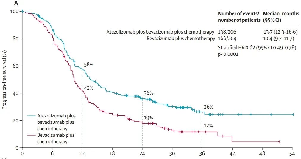 在2018年10月8日至2021年8月20日期间,评估资格的519名患者中有410名被招募。使用阿特珠单抗的中位无进展生存期为13.7个月(95%置信区间12.3-16.6),而标准治疗组为10.4个月(9.7-11.7)(风险比[HR]=0.62 [95%置信区间0.49-0.78];p<0.0001);在中期总生存期分析中,中位总生存期分别为32.1个月(25.3-36.8)对22.8个月(20.3-28.0),(HR 0.68 [95%置信区间0.52-0.88];p=0.0046)。3级或更严重的不良事件在实验组的患者中发生率为79%,在标准组的患者中为75%。1-2级的腹泻、关节痛、发热和皮疹在使用阿特珠单抗的患者中有所增加。