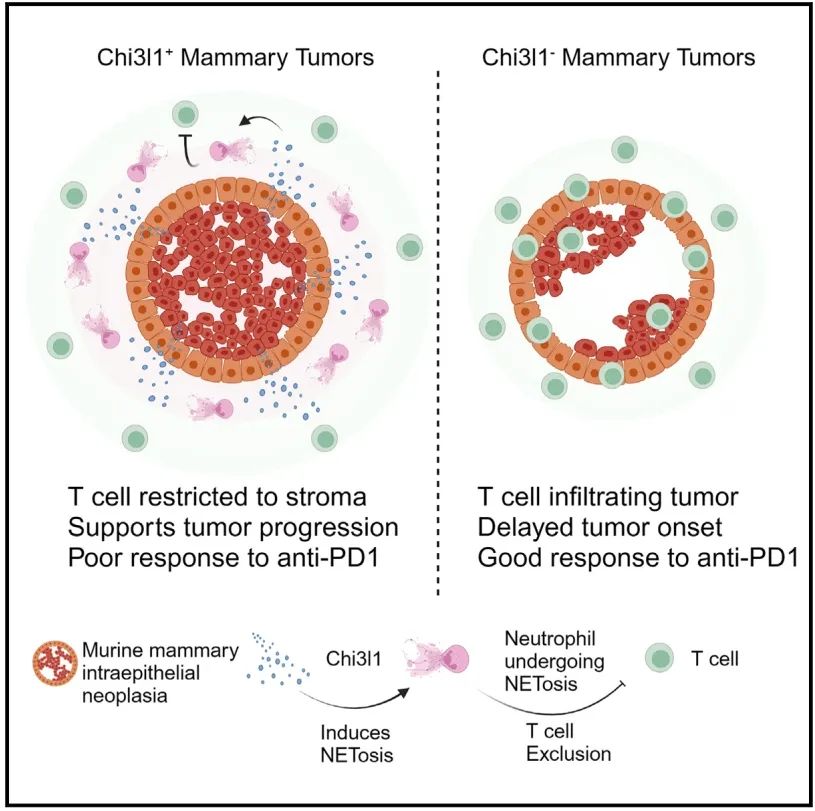 本项研究聚焦于三阴性乳腺癌(TNBC)中CD8阳性T细胞受到的一种特殊限制——间质受限,揭示了Chi3l1这一细胞因子在其中所起的关键作用。研究发现,Chi3l1不仅在TNBC中表达升高,而且还在其他多种表现T细胞间质受限的实体瘤中表达增加。通过在动物模型中剔除Chi3l1,研究者成功激发了抗肿瘤免疫反应,并延缓了肿瘤的发展。这一过程涉及中性粒细胞的招募与外网的形成,这些外网在物理上阻碍了T细胞向肿瘤内部的渗透。