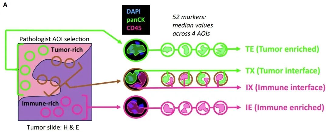 设计、环境和参与者:采取治疗前肿瘤样本,通过血红蛋白和伊红染色以及免疫荧光(panCK和CD45)来选取四个感兴趣区域(ROI):肿瘤富集区(TE)、免疫富集区(IE)、肿瘤/免疫界面(肿瘤界面 = TX 和免疫界面 = IX)。