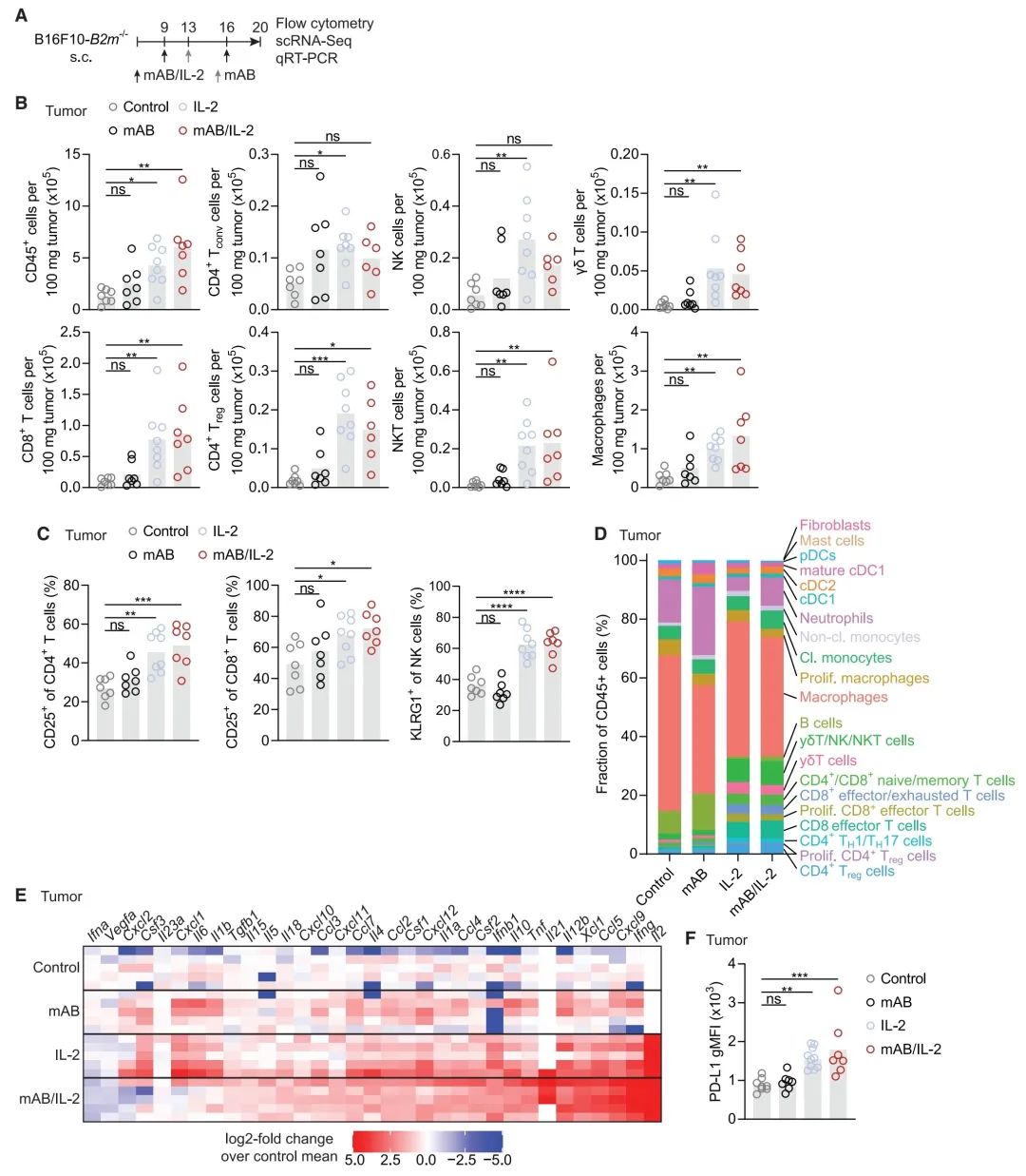 主要组织相容性复合体(MHC)I类抗原呈递缺陷是癌症免疫逃逸的常见机制,但对其机制和解决这一挑战的潜在策略仍然了解不足。通过β2-微球蛋白(B2M)缺陷的小鼠肿瘤模型,研究者发现MHC I类缺失导致肿瘤微环境(TME)的大量免疫荒漠化以及对免疫、化疗和放疗的广泛抵抗。该研究还展示了通过mRNA技术编码持久性IL-2进行治疗可以恢复免疫细胞浸润、IFNγ促进的高度炎症的TME特征,并且当与针对肿瘤的单克隆抗体(mAB)联合使用时,可以克服治疗抗性。意外的是,这种治疗的有效性是由释放IFNγ的CD8+ T细胞驱动的,这些细胞识别由TME中活化的巨噬细胞交叉呈递的新抗原。在IL-2治疗下,这些巨噬细胞获得了增强的抗原呈递能力和其他M1表型相关特征。该研究的发现强调了在治疗MHC I类缺陷癌症中恢复新抗原特异性免疫应答的重要性。