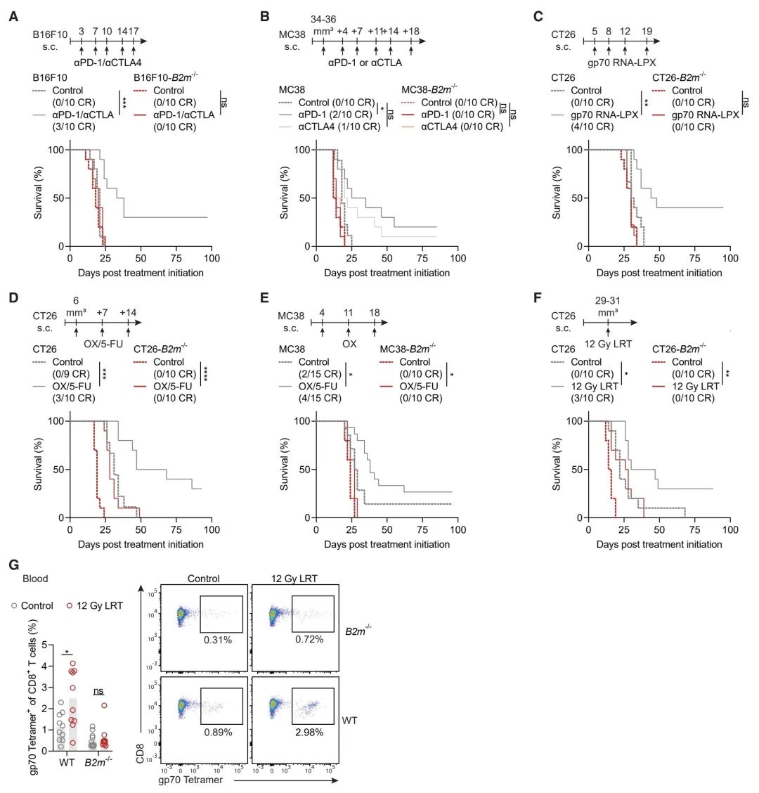 (A–F) 在接受以下治疗后,携带所示亲本或B2m-/-肿瘤变异体的小鼠的存活情况:αPD-1/αCTLA4组合治疗或同种型对照(A;n = 10)、αPD-1、αCTLA4或不相关对照单克隆抗体(B;n = 10)、编码gp70的mRNA-LPX疫苗或空载体mRNA-LPX作为对照(C;n = 10)、奥沙利铂(OX)/氟尿嘧啶(5-FU)双药治疗或车辆对照(D;n = 9–10)、OX或车辆对照(E;n = 10–15)、局部放疗(LRT),剂量为12 Gy或0 Gy作为对照(F;n = 10)。CR表示完全缓解。