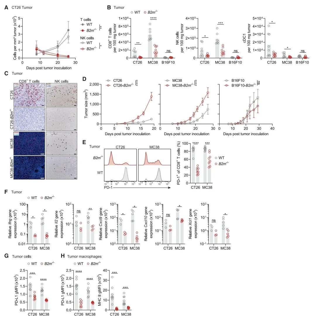 (F) 通过定量实时PCR(qRT-PCR),在接种后19天内确定CT26(n = 3)或MC38(n = 5)WT和B2m-/-肿瘤组织中所示基因的表达。