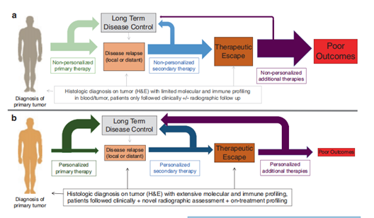 Fig 31.3 (A)动态和静态标记对免疫检查点抑制剂阻断的重要性。在传统的癌症治疗中,一旦诊断出原发肿瘤,通常会通过有限的分子分析和肿瘤组织以及可能的血液中的免疫图谱进行肿瘤评估。治疗通常是基于经验的非个性化方案,患者接受临床跟踪和可能的放射学随访。在这种情况下,相当大比例的患者会经历疾病复发,并接受非个性化的二次治疗——通常在最少或没有生物标志物评估的情况下进行。同样,反应的患者很少,大多数患者最终经历了治疗逃逸,总体结果较差。(B) 在癌症治疗的创新方法中,通过在治疗前进行广泛的分子和免疫图谱分析,来扩展原发肿瘤的组织学诊断。选择个性化的初级治疗方案是基于这些详细的见解,从而使更高比例的患者实现长期疾病控制。只有少部分患者发生疾病复发,此时,个性化的二次治疗方法被用来结合复发肿瘤的分子和免疫图谱以及肿瘤和血液的治疗响应图谱。较少的患者经历疾病逃逸,当这种情况确实发生时,基于更精细化的治疗策略,对个性化方法的响应更高。通过这种方法,治疗效果不佳的患者非常少见。