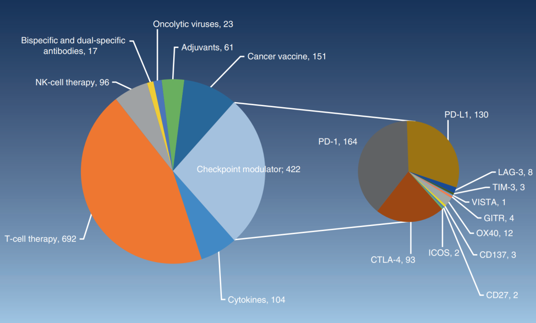 Fig 32.5 免疫肿瘤学(I-O)疗法的一期临床试验(来源:ClinicalTrials.gov,访问日期:2017年1月10日)。此图仅展示了使用关键词“抗癌类”和“癌症”进行搜索的一期试验结果,其中“抗癌类”涵盖了图中详细说明的每个疗法类别。这样的分类有助于更好地理解当前免疫疗法试验的分布和重点研究领域。