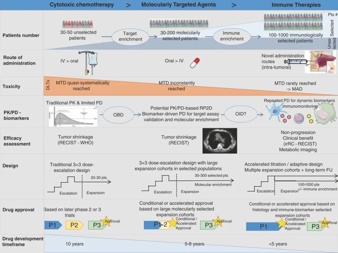 Fig .32.4 展示了自细胞毒性化疗时代以来,一期临床试验在进入免疫肿瘤学时代后的演变(改编自Postel-Vinay等人,经《肿瘤学年鉴》编辑部许可)。自细胞毒性化疗时代以来,一期临床试验已经发生了显著的变化。这些试验已经从小规模研究转变为大规模研究,能够在平行扩展队列中纳入数百名根据分子特征或表型精选的患者。随着最大耐受剂量(MTD)不经常达到,新的给药途径和剂量推荐方法已经被开发。药效学和药代动力学参数在确定后期试验的推荐剂量方面发挥着越来越重要的作用。基于免疫监测的药代动力学(PK)和药效学(PD)数据推导出的免疫最佳剂量,其概念是否可以类似于靶向制剂的最佳生物剂量用于免疫刺激剂,这一点值得进一步探索。同时,早期试验的设计也在平行发展,旨在保持快速的剂量递增阶段,并评估大型选择性队列的疗效。因此,传统的1-2-3期药物开发策略正在被整合的1/3期试验所取代,这些试验绕过了传统的二期研究。所有这些进化显著缩短了药物开发的时间,并且对患者更为有利。