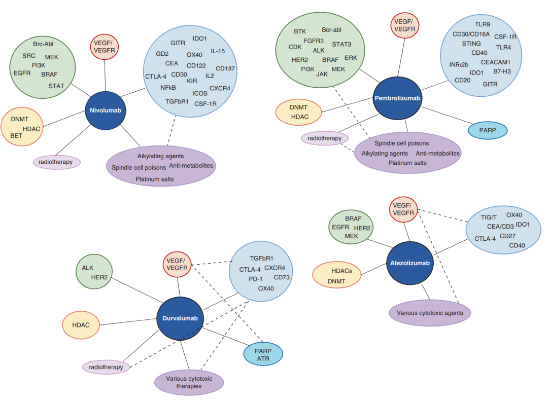 在开发联合疗法时,必须考虑到所使用药物的性质。将免疫药物与非免疫药物(包括细胞毒性药物、靶向疗法或抗血管生成药物)结合使用在许多情况下是可行的,尤其是在两种药物的全剂量下,因为它们预期具有有限的重叠毒性或药物代谢动力学(PK)相互作用。然而,必须格外谨慎。例如,尽管某些组合在全剂量下的细胞毒素、小分子或靶向血管生成的抗体是可行的,其他组合则被证明是不可容忍的,如评估vemurafenib与ipilimumab联合治疗黑色素瘤的一期试验因肝毒性而提前终止。