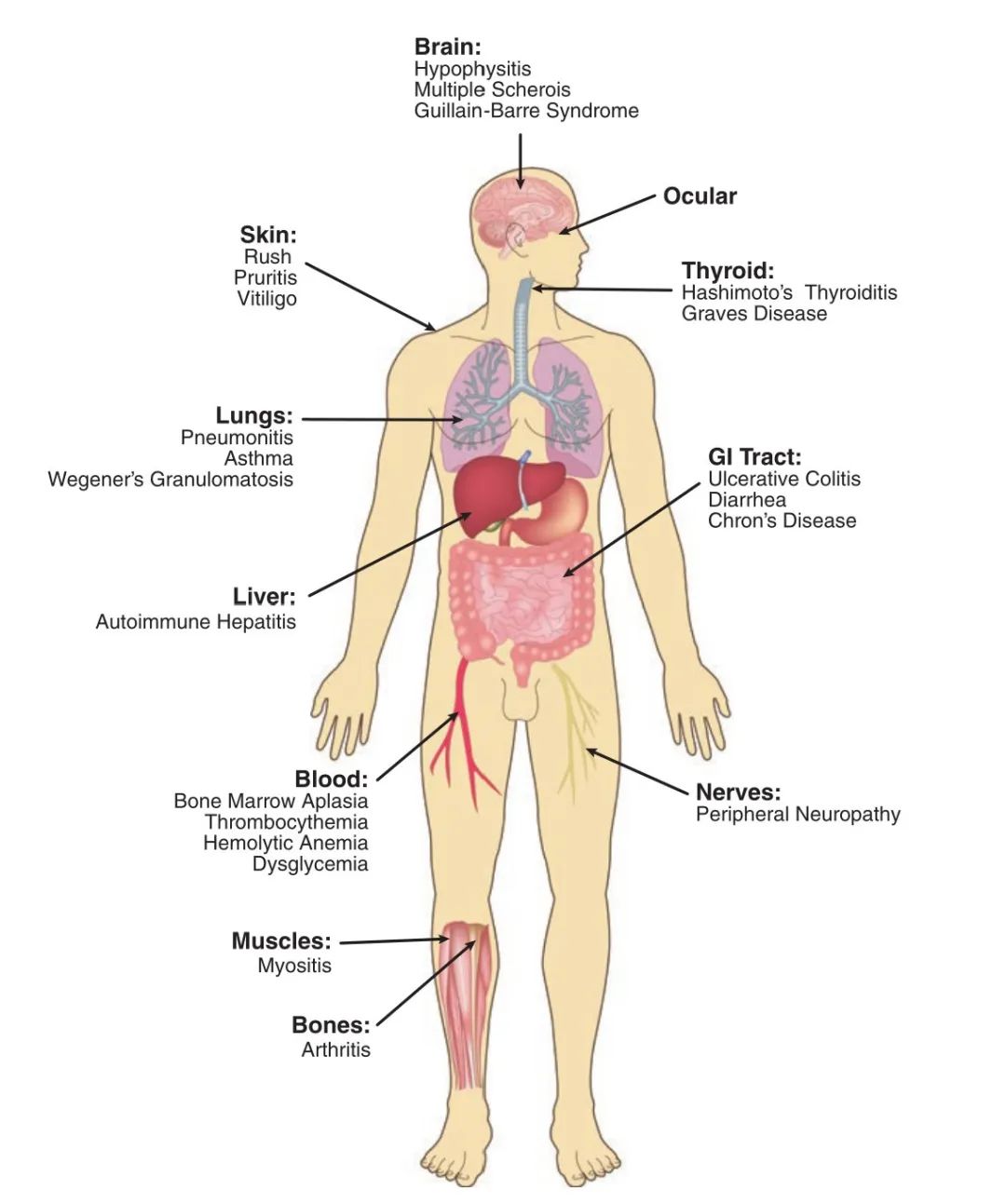Fig 33.1 受免疫相关不良事件影响的机体组织