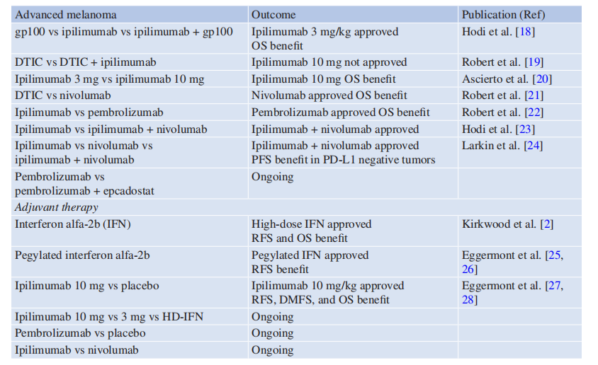 Table 34.1 干扰素、伊匹单抗、纳武单抗和派姆单抗的关键III期免疫治疗试验
