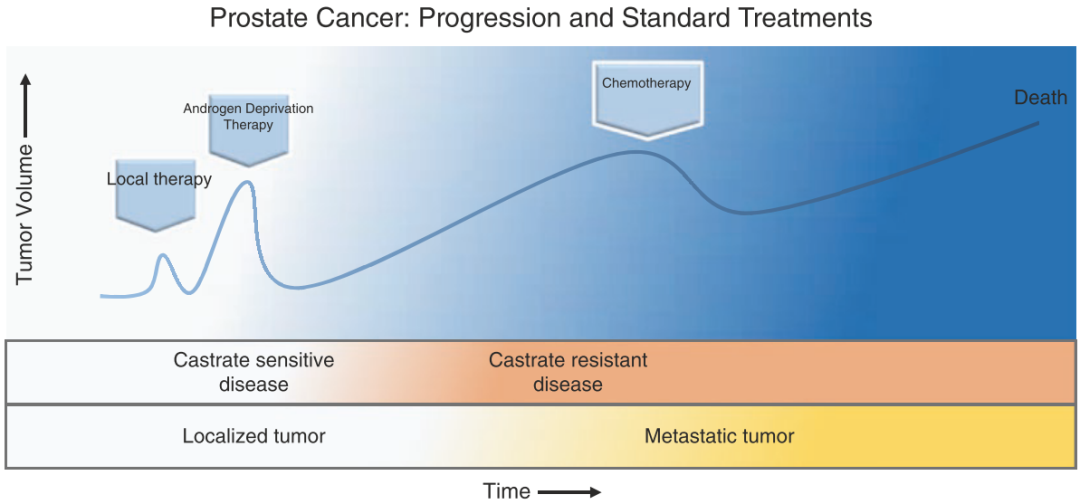 Fig 35.1 显示了前列腺癌从初次诊断到患者死亡的疾病进展过程。手术和放疗等局部治疗手段可以有效控制早期疾病。对于初次接受治疗的雄激素依赖性肿瘤,抗雄激素治疗通常能带来显著的临床获益。然而,一旦疾病进展至晚期转移性去势抵抗性前列腺癌,患者的预后较差,且可供选择的治疗方案非常有限。