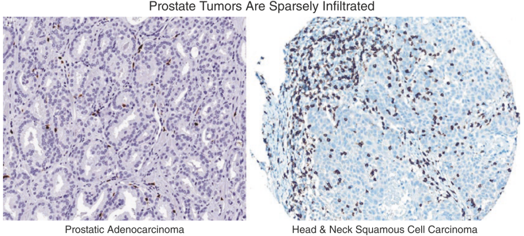 Fig 35.2 对比了前列腺癌组织与头颈部癌组织中CD8+ T细胞的浸润模式。免疫组化染色结果显示,相较于头颈部肿瘤,前列腺肿瘤中细胞毒性T细胞(CD8+ T细胞)的浸润显著减少。