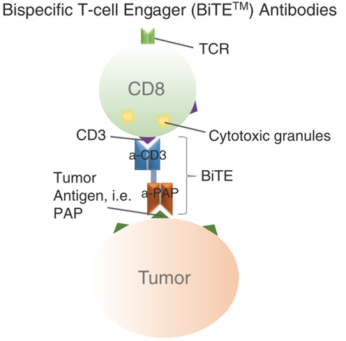 Fig 35.4 通过BiTE™抗体激活T细胞。BiTE™或DART™抗体通过结合T细胞表面的CD3分子,使T细胞被激活并对表达特定抗原(如PAP)的肿瘤细胞产生细胞毒性反应,而无需考虑T细胞的TCR特异性。BiTE™抗体由一个多肽链连接体组成,而DART™抗体则由两条多肽链和一个链间二硫键组成。