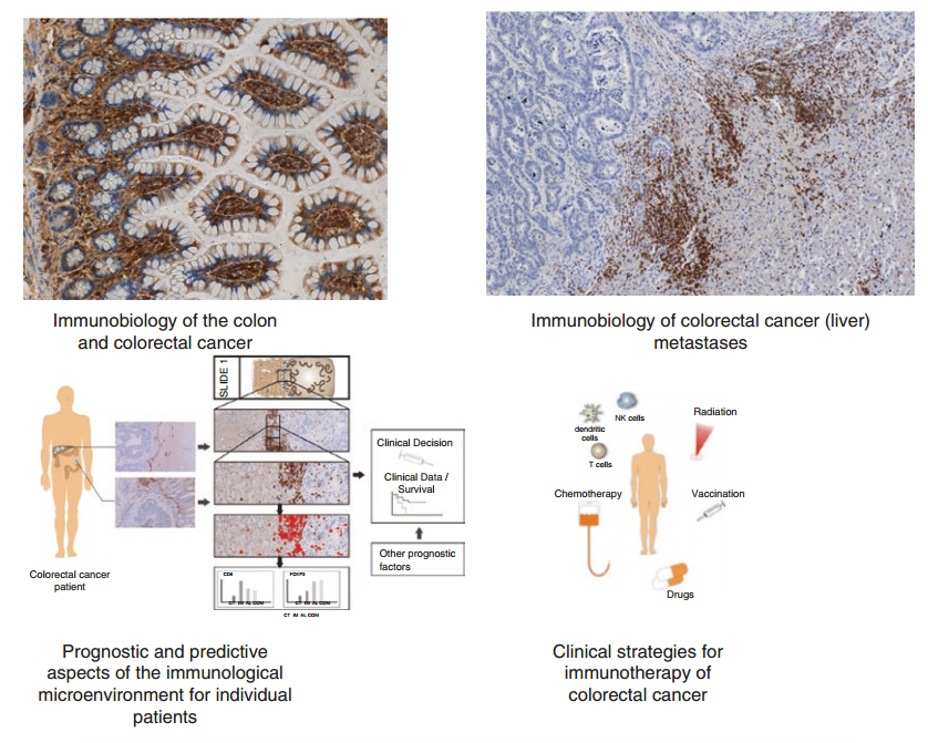 关于结直肠癌免疫过程的早期研究之一是病理学家观察到结直肠癌原发肿瘤附近存在淋巴结构。这一发现是基于已知的肠道内存在Peyer斑块(以及其他淋巴样结构)而得出的。随着特异性染色技术的发展,病理学家和免疫学家得以更好地表征免疫细胞浸润,并系统地研究结直肠癌及其周围的免疫细胞。研究不仅证实了效应T细胞的存在,还进一步揭示了局部微环境的组成与原发肿瘤各个阶段的临床病程之间的密切联系。